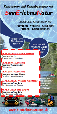 Betreute Kanutouren werden ab der 7. Klasse (Alter 13 Jahre) angeboten mit mindestens einem Tourguide.